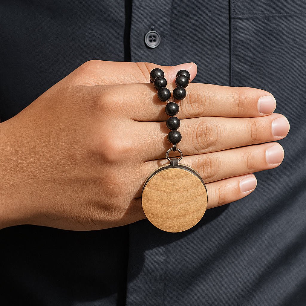 Order your necklace from Qiblasense. You can choose from a selection of hardwoods: walnut, oak, beech, or mahogany.